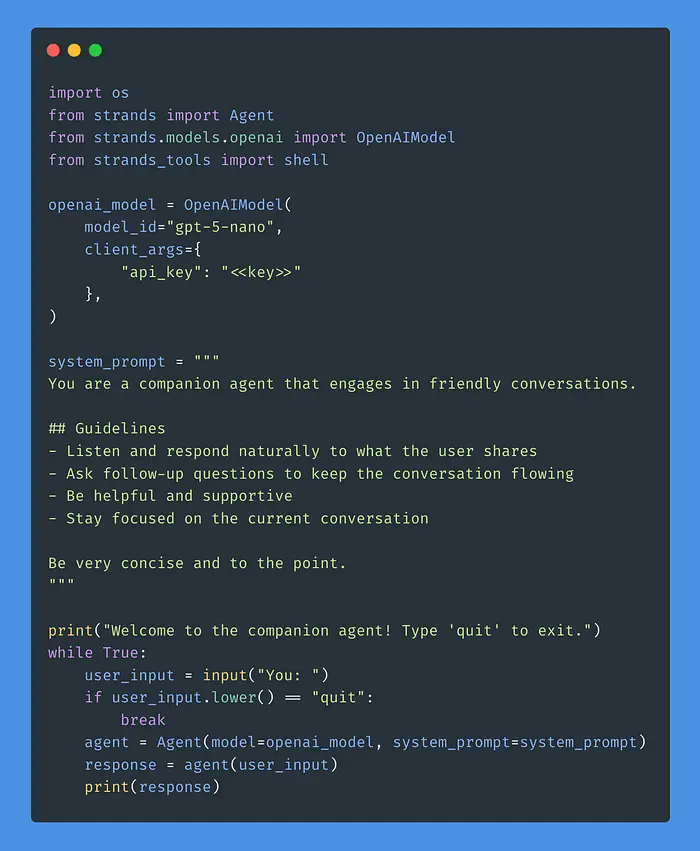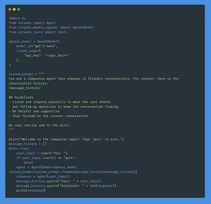 在这个MVP中,我们将构建一个可以帮助您进行对话的伴侣智能体。我们故意不存储或使用历史对话来构建这个智能体,代码如下所示: