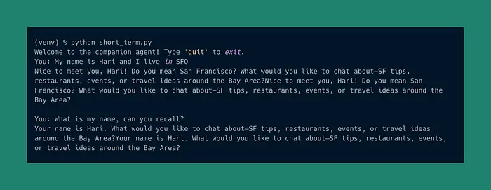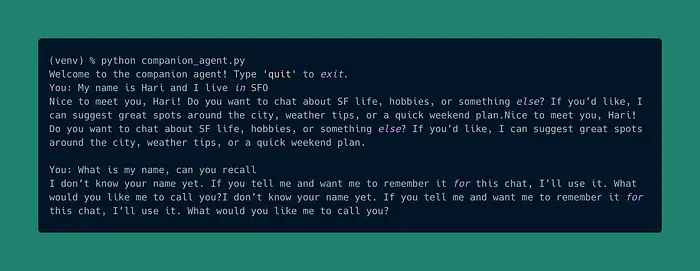 一个实用的路径很直接:从无记忆开始了解基线,添加短期记忆修复会话内的"金鱼"行为,然后引入捕获跨会话摘要、偏好和语义知识的长期记忆工件。从那里,您可以迭代:定义明确保存规则,积极修剪以避免提示膨胀,并继续用真实对话测试,就像激发这个伴侣智能体的SFO-NYC航班一样。