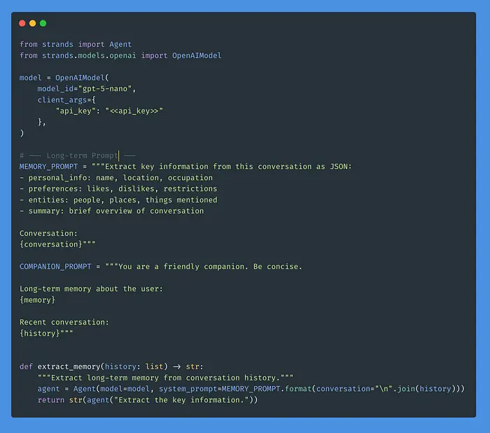 既然我们有了用例和不同记忆类型的心智模型,让我们通过构建伴侣智能体来测试它。为了简单起见,我们将用James替换为一个可以积极参与对话并记住分享细节的智能体。我们将使用AWS Strands构建这个伴侣智能体。