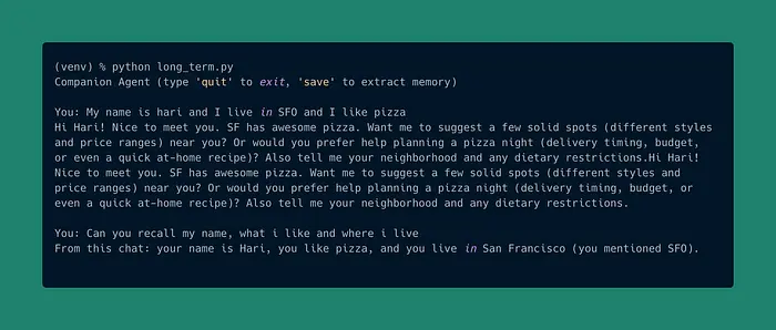 如您所见,当用户输入"generate"命令时,智能体生成长期记忆工件并在未来的对话中使用它。这是一个更人性化、更有吸引力的体验。