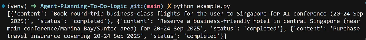 在本示例中,这些工具是模拟的,并不执行实际的预订操作;它们仅用于演示代理的规划逻辑以及它如何使用待办事项列表。