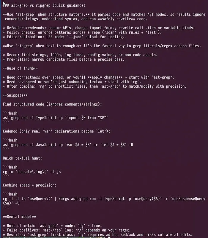 如果你要搜索文本,请使用 ripgrep。如果你要修改代码——重构、重写或检查——请使用 ast-grep。