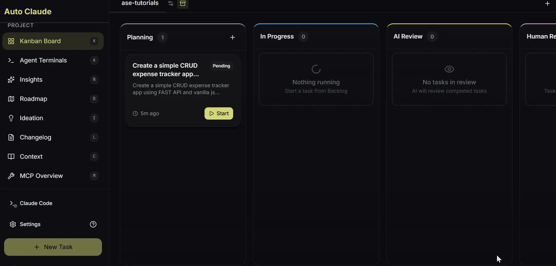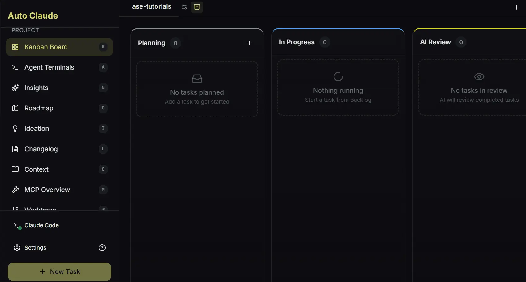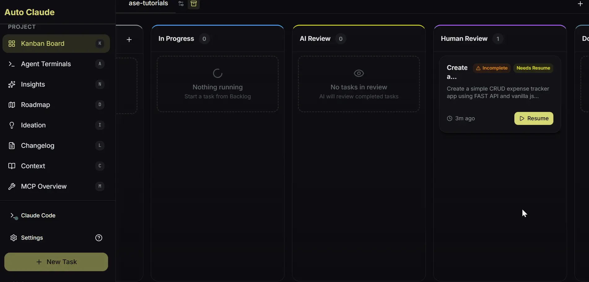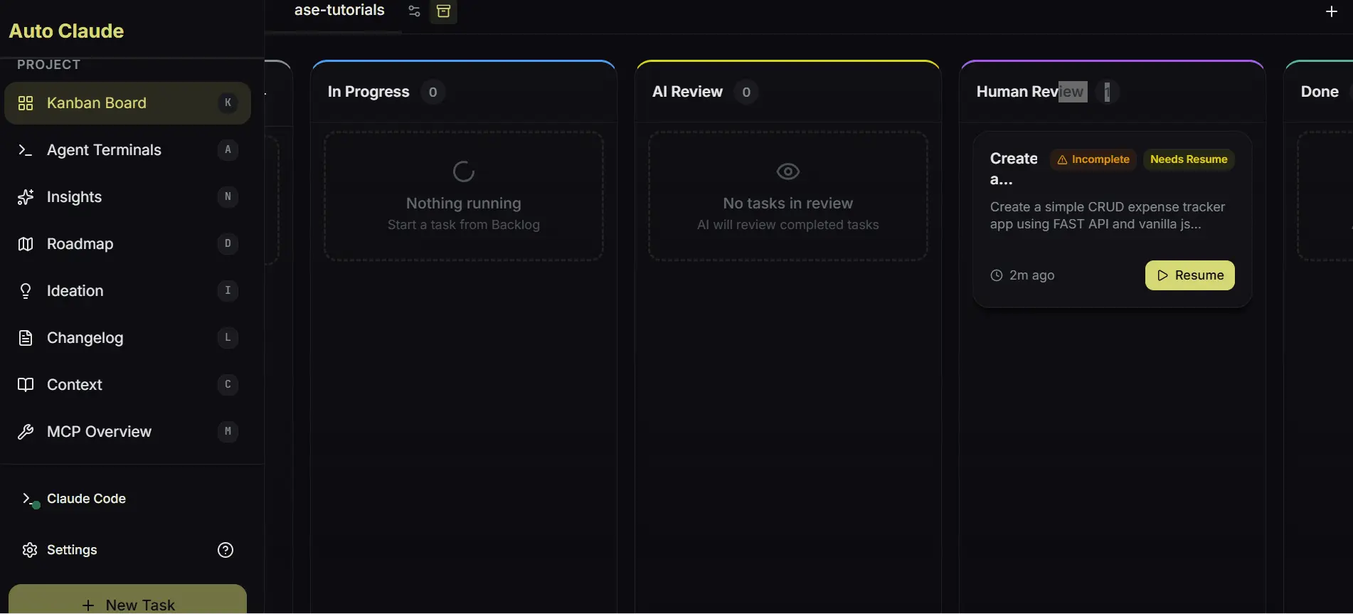 Auto Claude改变了这一点;你得到一个看板。你创建一个带有标题和描述的任务卡,点击开始,系统接管。