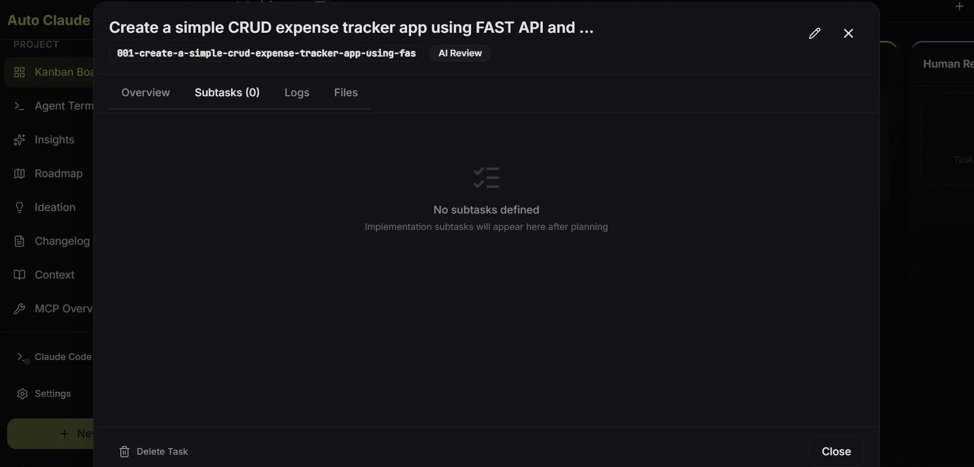 系统批判它刚刚构建的内容,检查问题,并验证实施是否匹配原始任务描述。只有通过这个自审查后,任务才会移动到人审查,在那里你可以检查差异、运行测试,并决定是否合并。