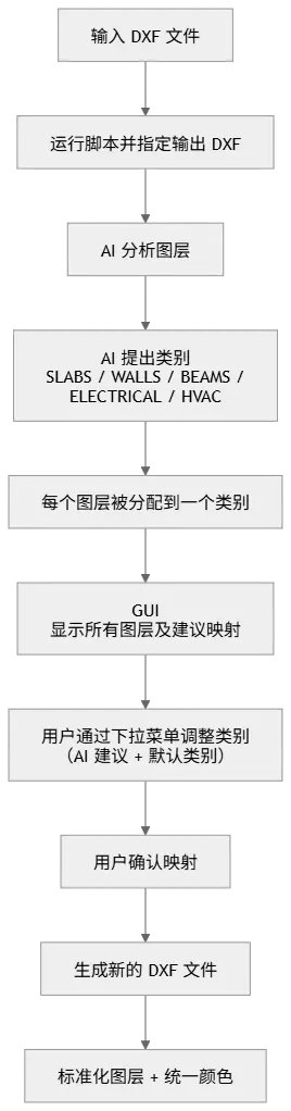 - 确认后,生成一个新的 DXF,其中包含标准化的图层和一致的颜色。