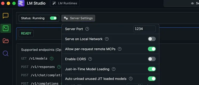 首先,启动 LM Studio 并启动你的本地语言模型。确保服务器正常运行,确认它可以通过 http://localhost:1234(默认端口)访问。