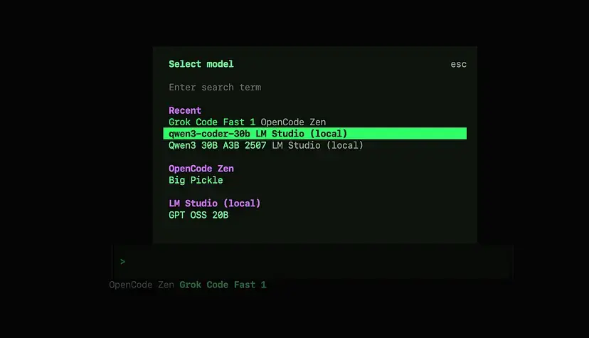 默认情况下,OpenCode 使用 Grok Code 作为其模型,但仅限于有限使用。这就是为什么我们要将其连接到 LM Studio,以使用完全本地的语言模型——为你提供无限访问和完整的隐私。