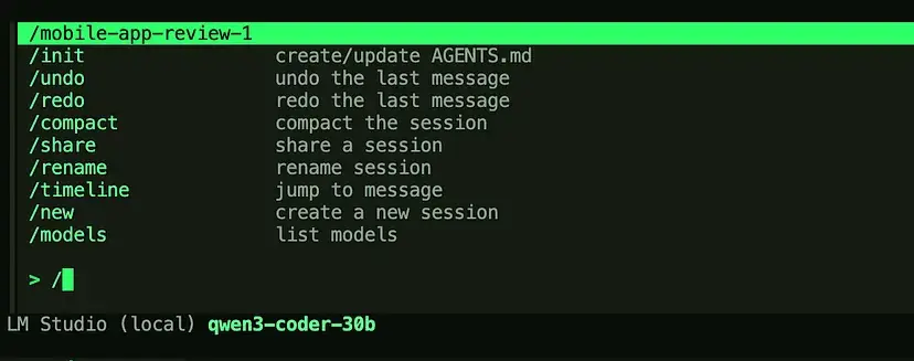 当您准备好审查一个应用时,打开 OpenCode 并按 / 打开命令面板。选择我们创建的 /mobile-app-reviews-1 并确定您的审查目标的绝对路径,然后按 Enter。AI 将开始分析您的项目。