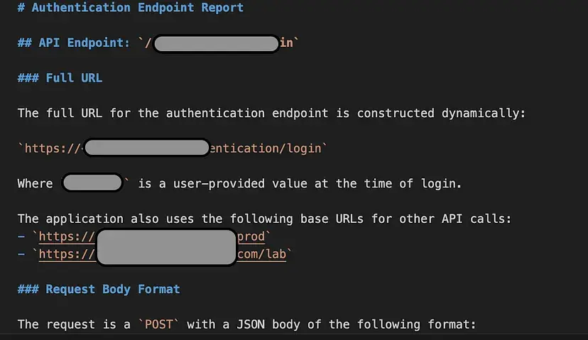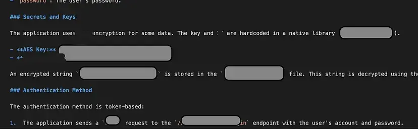 Save the findings to a Report.md file.这个命令对移动应用的认证流程进行代码审查,并生成一份简明的 markdown 安全报告,总结端点、请求结构、密钥、认证逻辑和风险,并将结果保存到 markdown 文件中。如今,攻击者经常分析 APK 文件中的线索,以发现针对后端服务的方式。因此,在进行安全代码审查时,识别这些线索并帮助开发人员修复潜在漏洞至关重要。