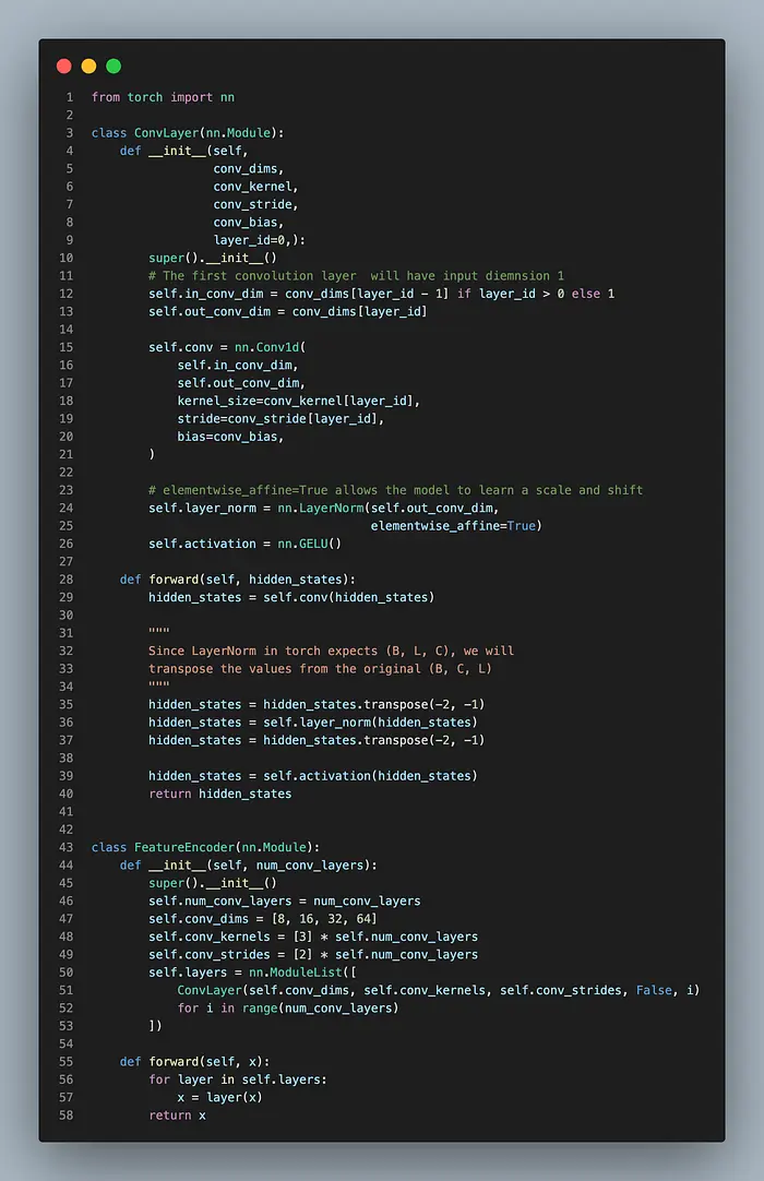 在这里,ConvLayer 模块首先接收原始音频(作为一维信号),并使用步长 2(在本例中)来缩短其长度。也就是说,我们不再对语音信号中的每个样本应用卷积核,而是仅对语音信号中的每隔一个样本应用卷积核(并使用前一个样本和后一个样本通过加权求和来计算特征向量——因为在本例中卷积核大小为 3)。