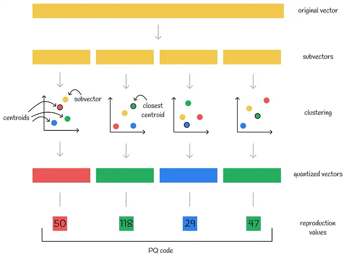 现在,对于 m 个子向量,将训练 m 个独立的码本。在推理过程中,对于查询向量,我们可以搜索查询的每个子向量的 m 个最接近的质心向量,将它们连接起来,得到最终答案。