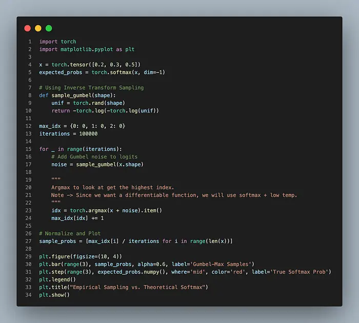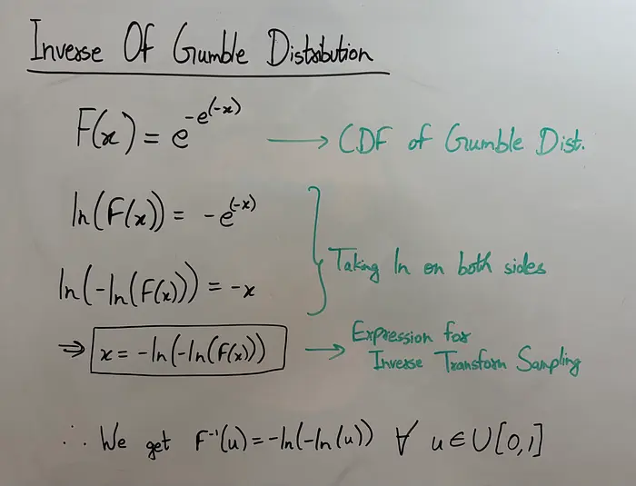 这就是 Gumbel 分布的用武之地。事实证明,如果你对 0 到 1 之间的均匀分布进行采样,然后使用 Gumbel 分布的累积分布函数 (CDF) 执行逆变换采样,并将结果加到 logits(未归一化的原始分数)上,那么这些 logits 上的 softmax 函数(带温度)将遵循由 logits 的 softmax 函数定义的概率分布。这被称为 Gumbel-softmax 技巧。