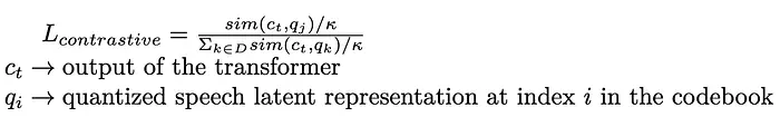 借鉴 BERT 架构,Wav2Vec2 会屏蔽一些随机时间步,Transformer 的任务是从 K 个表示中选择正确的量化潜在语音表示。这组“干扰项”是从同一语音的所有屏蔽时间步中均匀采样得到的。