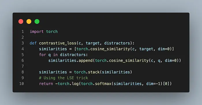 很自然地,你会认为像余弦相似度这样的相似性度量可以帮助我们找到“正确”的时间戳,你的想法完全正确!损失函数是缩放后的余弦相似度(由超参数缩放)除以所有缩放后的相似度之和。