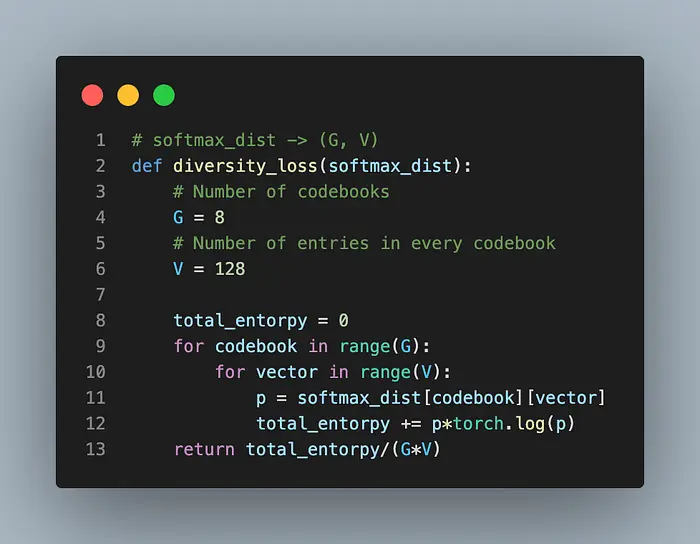 现在,除了对比损失之外,如果模型反复选择相同的码本条目,我们也希望对其进行惩罚。目标是使选择不同码本条目的分布趋向于均匀分布,因此我们希望最大化码本条目的平均 softmax 分布的熵。作者称之为多样性损失。
