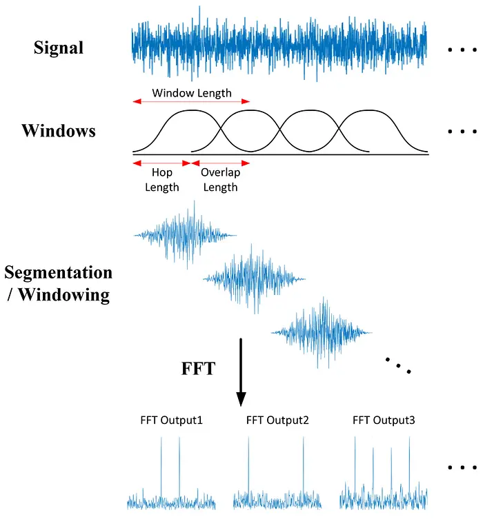 对音频信号进行傅里叶变换后,你会得到整个信号中每个频率级别(例如,100Hz、500Hz、2000Hz)对应的能量级别。然而,对于语音信号而言,对整个信号进行傅里叶变换并不合理,因为我们感兴趣的是每个词对应的频率,而不是一个整体。这就引出了短时傅里叶变换 (STFT),即在一个较短的滑动窗口上进行傅里叶变换。