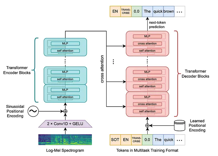 由于 Whisper 使用的是标准的 Transformer 架构,我们无需赘述。Whisper 的真正精髓在于其输入输出的结构,使其能够同时处理多个任务。