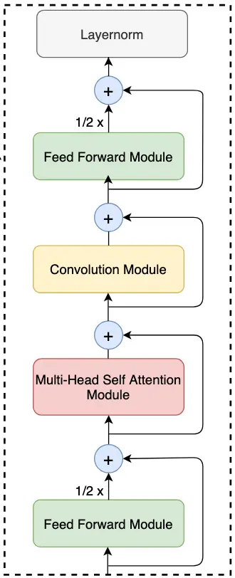 CNN 最重要的归纳偏置(就我们的应用场景而言)是局部性——卷积网络能够表示信号中的局部关系。为了兼顾两者的优势,谷歌在 Conformer 论文中提出了一种包含卷积块的 Transformer 编码器。
