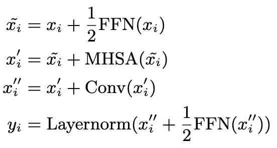受 Macaron-Net 的启发,Conformer 论文还将编码器中的 FFN 层拆分为两个“半层”。其思路是在输入进入注意力层之前对其进行预处理,然后再进行后处理,所有这些操作都旨在保持信号的“强度”与使用标准 MHSA -> FFN 时的信号强度相同。