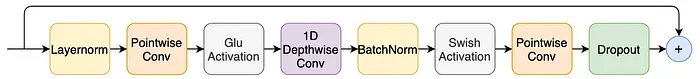 在编码器模块中,应用 MHSA 之后,Conformer 论文并没有直接使用线性层处理隐藏状态,而是使用卷积模块在处理隐藏状态之前提取局部上下文。
