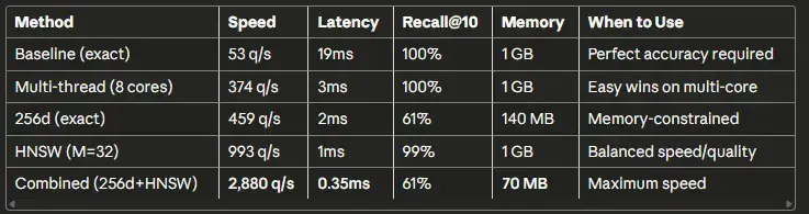 为什么这仍然重要: 它告诉你优化保留了大约 60% 的排序顺序。缺失的 40% 并不是错误的结果,只是排名不同。对于 RAG,你无论如何都会拉取 50-100 个块,这通常是可以接受的。