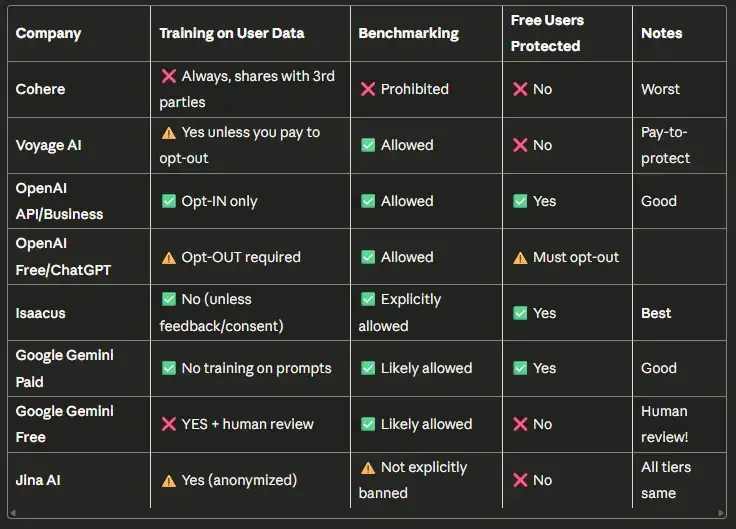 在深入实现之前,我花了一些时间做每个开发人员都应该做但大多数人没有做的:实际阅读各种嵌入 API 提供商的《服务条款》。我找到的结果……令人清醒。在 Claude 的帮助下,我得到了这张比较表: