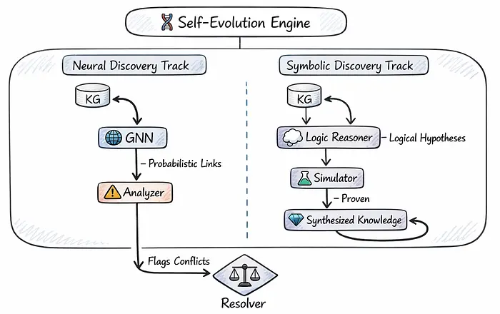 神经发现轨道(模式识别):图神经网络(GNN)分析整个KG的结构。它学习潜在模式,例如,某些分子子图如何与药物响应相关。它输出概率链接,如"Gene_M 被预测与 Pathway_N *相互作用,置信度0.82。"这些是数据驱动的假设,不是事实,并被发送到一致性分析器进行审查。