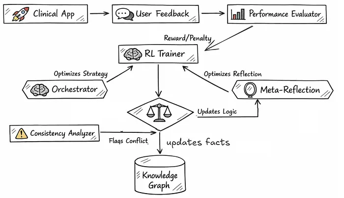 性能学习循环:系统的见解支持下游应用(例如,临床医生的决策支持仪表板)。来自这些应用的用户反馈,隐式(选择的治疗、重新构建的查询)或显式(竖起/放下大拇指),被捕获。性能评估器将其量化为奖励/惩罚信号。强化学习训练器使用这些信号来优化编排器和元反思模块。简而言之,它学习更好地规划。某个任务分解是否导致了高评价的见解?系统下次会更重视该策略。