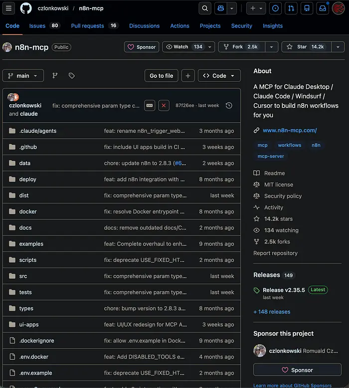 最后一件事。czlonkowski 针对每个新的 n8n 发布维护 n8n-mcp。开源、MIT 许可、无付费墙。一个人构建了使整篇文章成为可能的东西。去 star 这个仓库。这是我们欠他的最少。