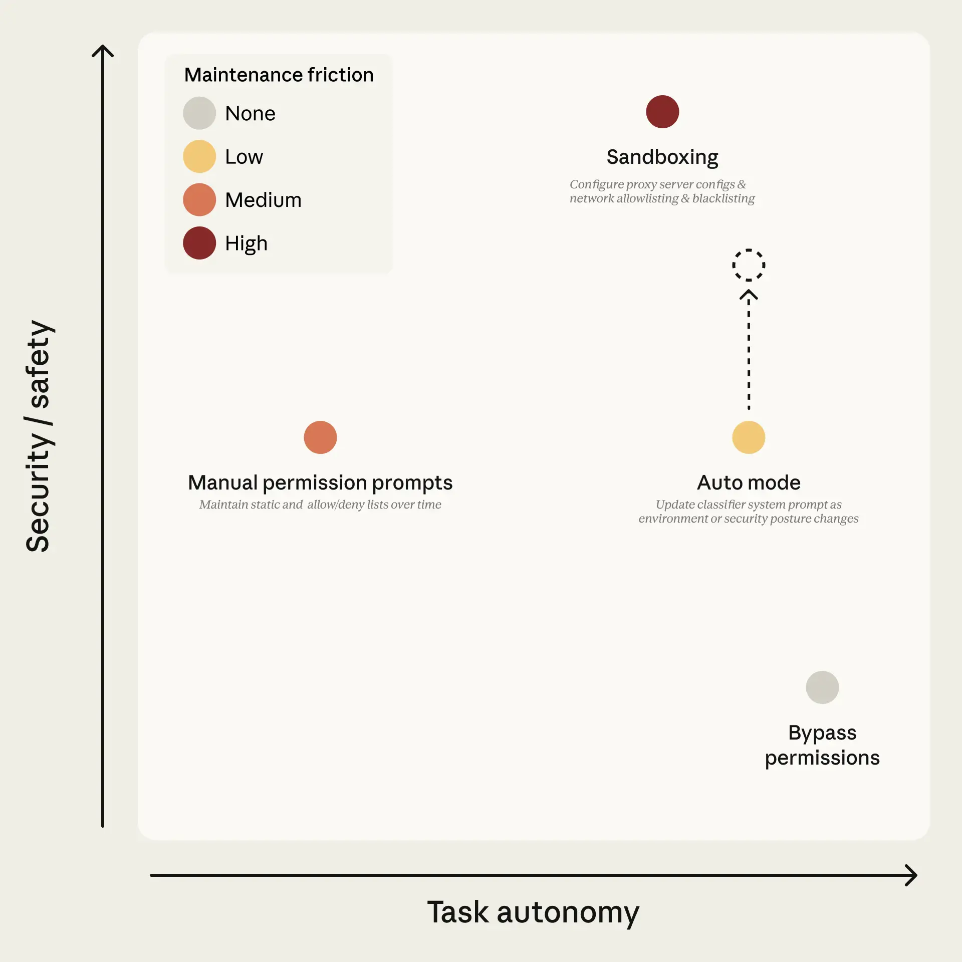用户有两种解决方案来避免这种疲劳:一种是内置沙箱,工具被隔离以防止危险操作;另一种是--dangerously-skip-permissions标志,它禁用所有权限提示并让Claude自由行动,这在大多数情况下是不安全的。图1展示了权衡空间。沙箱是安全的但维护成本高:每个新功能都需要配置,任何需要网络或主机访问的操作都会破坏隔离。跳过权限是零维护但不提供保护。手动提示处于中间位置,实际上用户接受了其中93%。