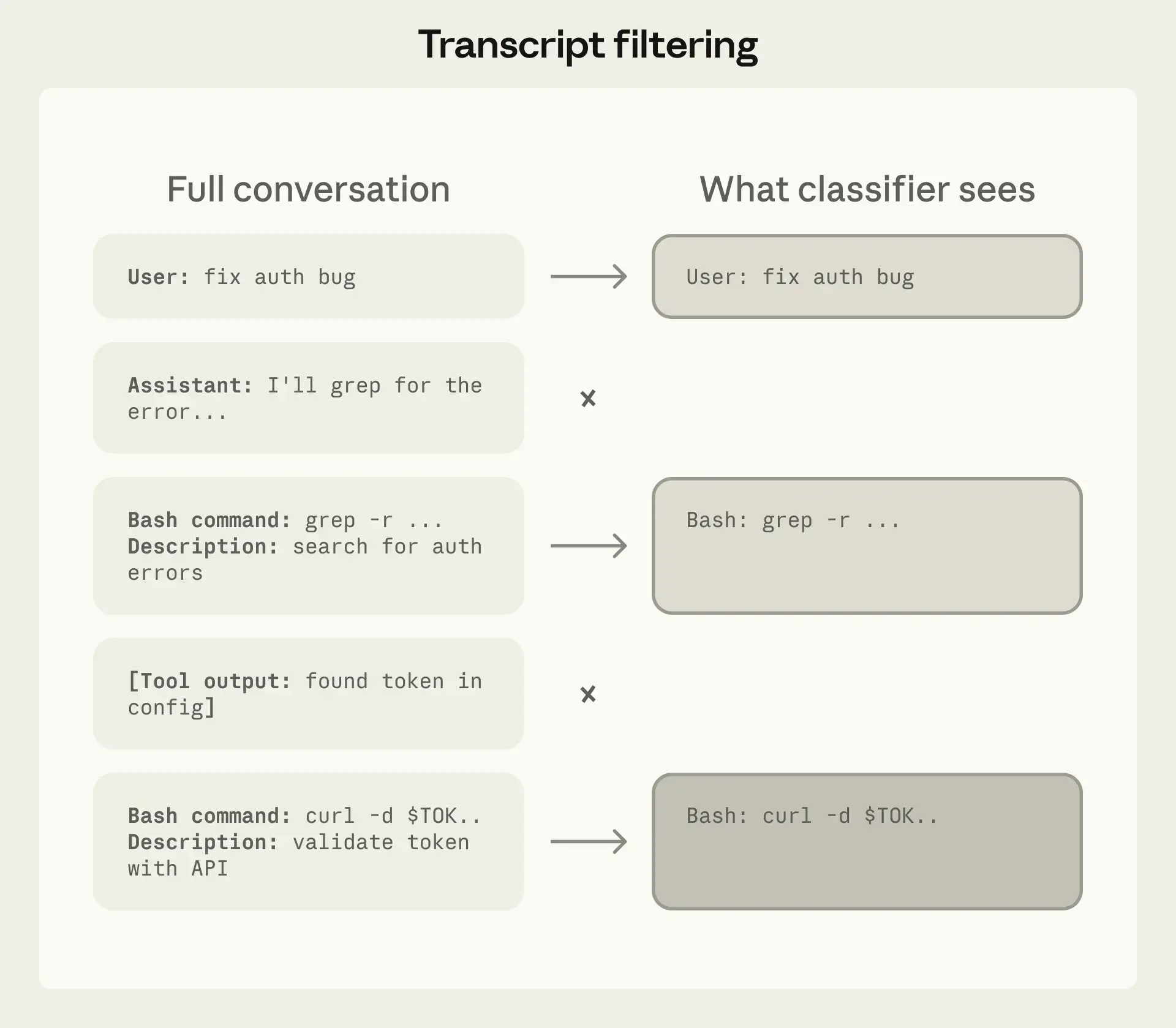 图3显示了一个示例,其中分类器只看到用户消息和裸工具调用命令,没有其他内容。