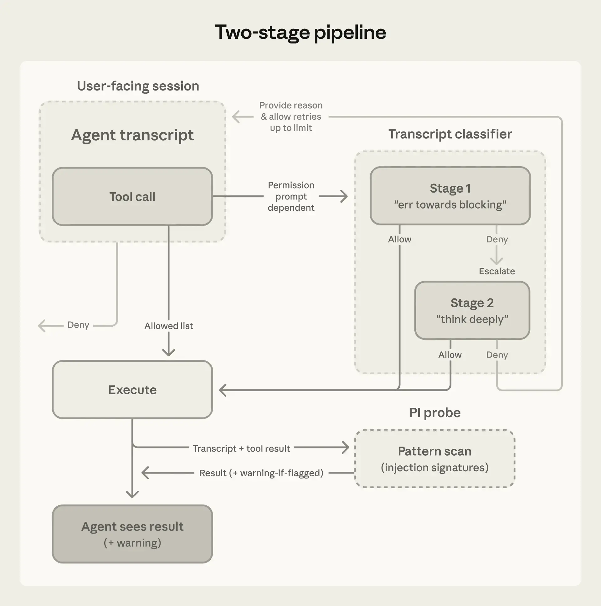 第3层:转录分类器。转录分类器看到其他所有内容,包括shell命令、网页获取、外部工具集成、子代理生成、项目目录外的文件系统操作。第1阶段是快速的单token(是/否)过滤器,指示为偏向阻止;如果它标记了,第2阶段使用链式推理重新评估相同的输入以减少误报。
