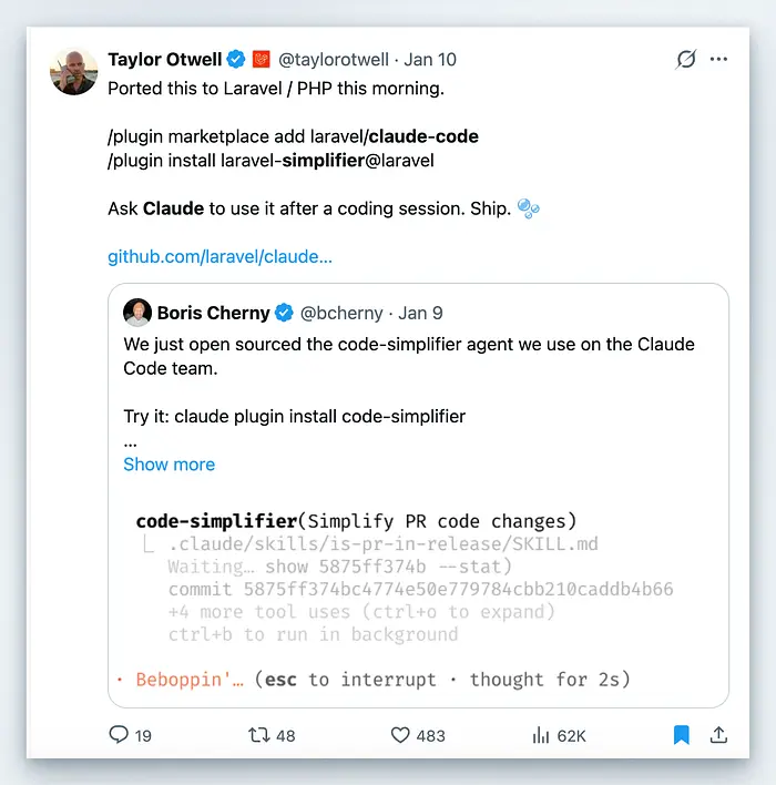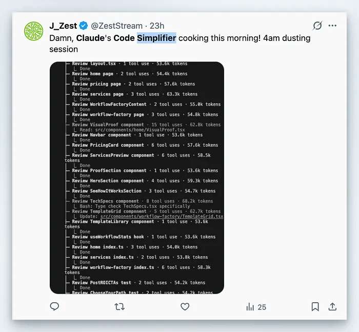 这就是代码简化插件所做的。它是 Claude Code 团队在 Anthropic 内部使用的相同工具,用于保持其自身代码库的清洁。 尝试过的开发者看到令牌使用量减少 20-30%,代码显著更清晰。