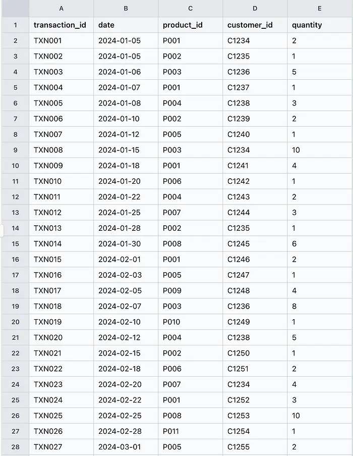 - Columns: date, product_id, customer_id, quantity, price, region