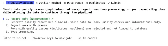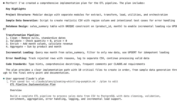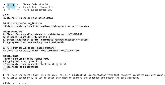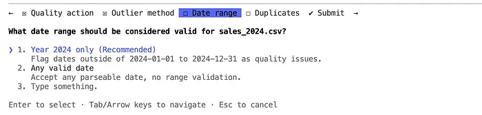 validate date ranges, and create a quality report"Claude 进入规划模式,然后提出问题: