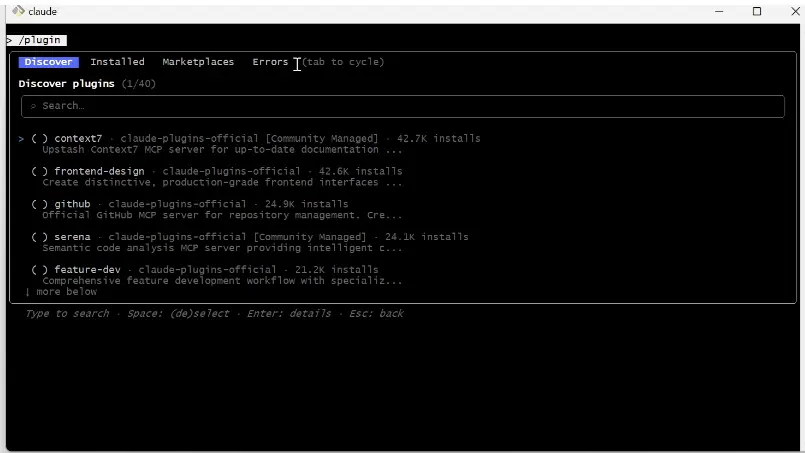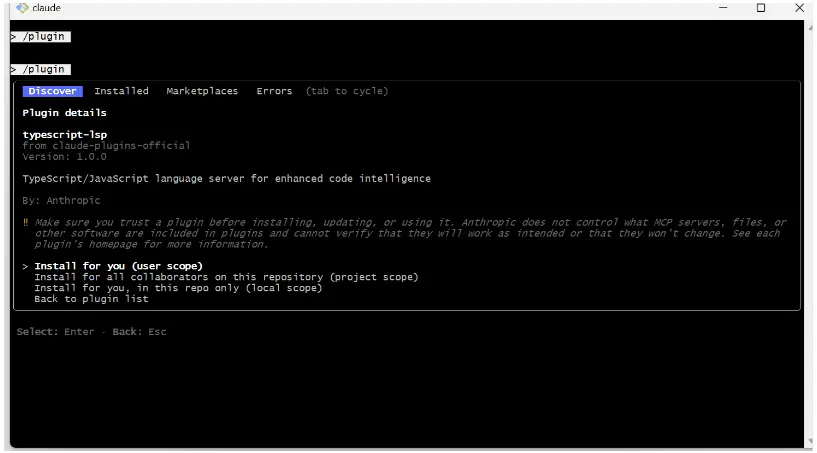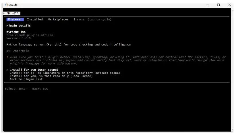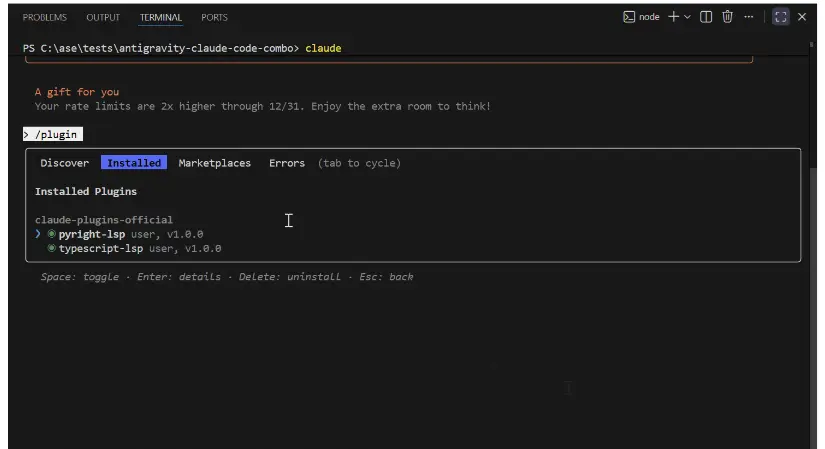 安装插件后,运行 /plugin 并检查“已安装”选项卡。然后使用类似“使用 LSP 查找对 X 的引用”这样的简单查询进行测试,以确认其正常工作。