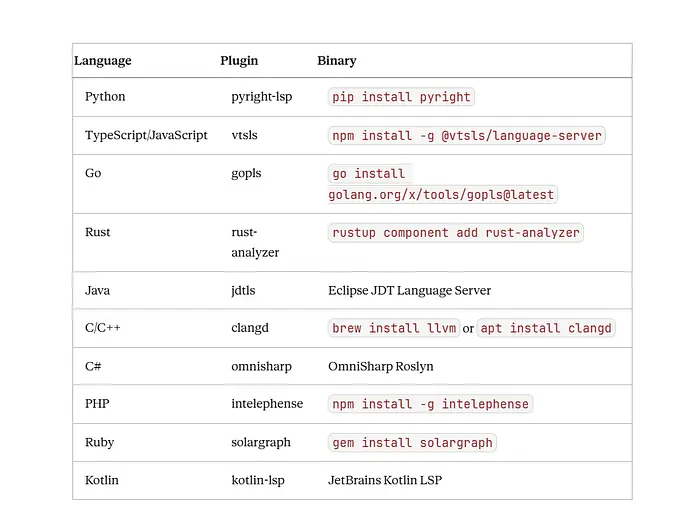 - 语言服务器必须单独安装。仅安装插件是不够的。您需要在系统上安装实际的语言服务器二进制文件(例如 pyright、gopls、rust-analyzer 等),并将其添加到 PATH 环境变量中。