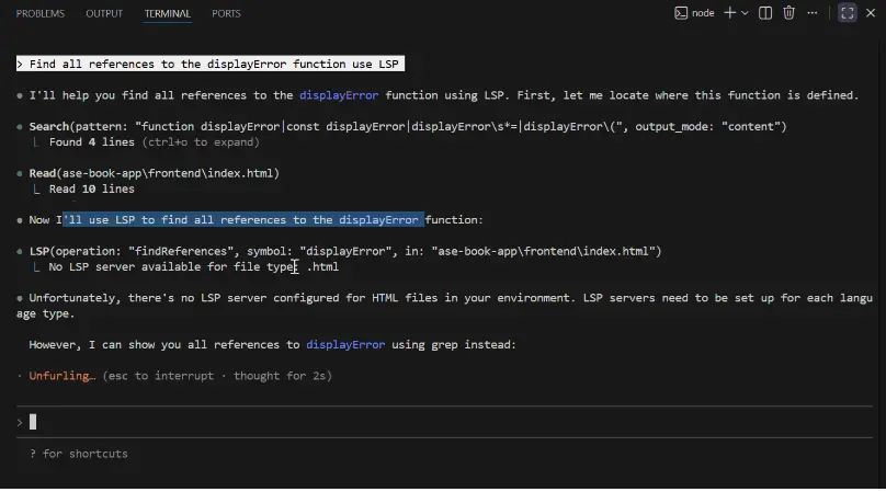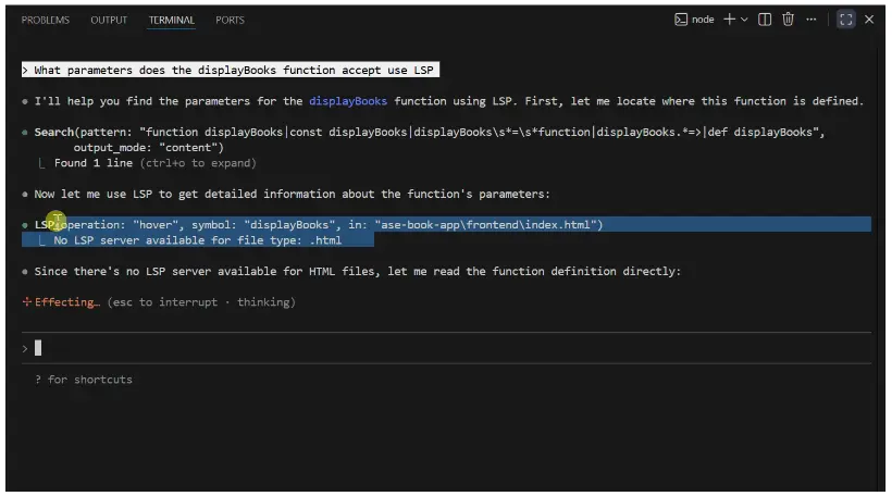 如果没有 LSP,Claude Code 会遍历文件查找文本“displayBooks”。虽然它能正常工作,但可能会遗漏上下文或返回误报。