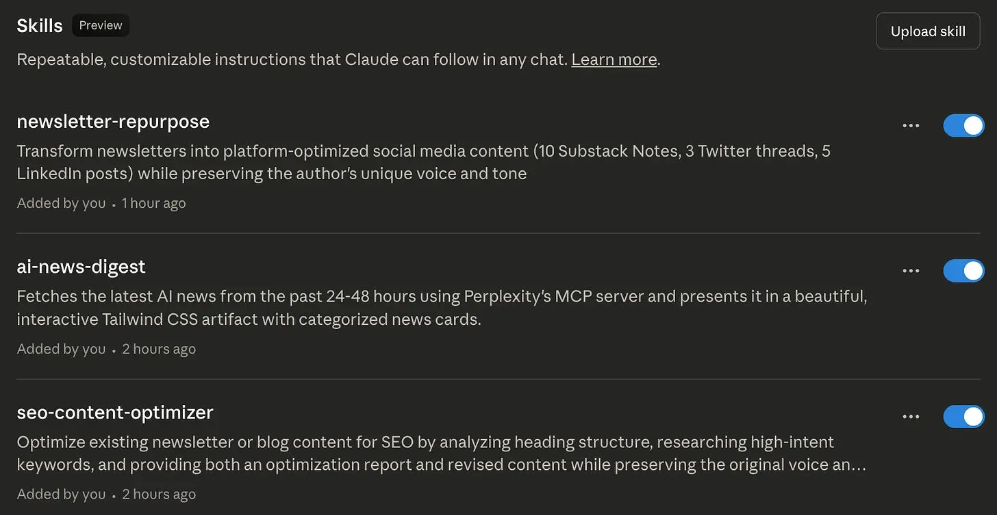 我构建了三个技能: SEO 内容优化器、通讯重新调整用途和 AI 新闻摘要。