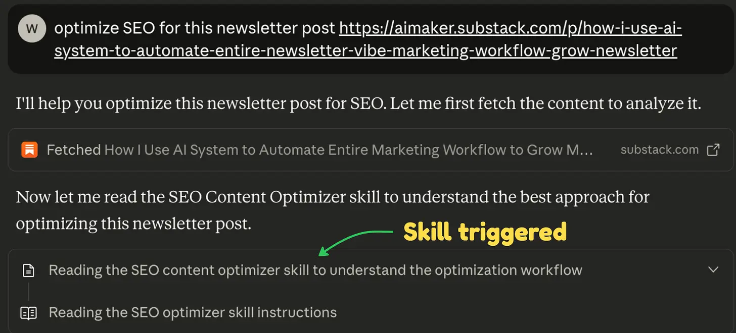 我只是粘贴内容并说"为此优化 SEO"。Claude 加载 Skill,运行整个工作流程,并创建一个 SEO 修订版本,以及报告已完成的工作和你可以稍后改进的内容。