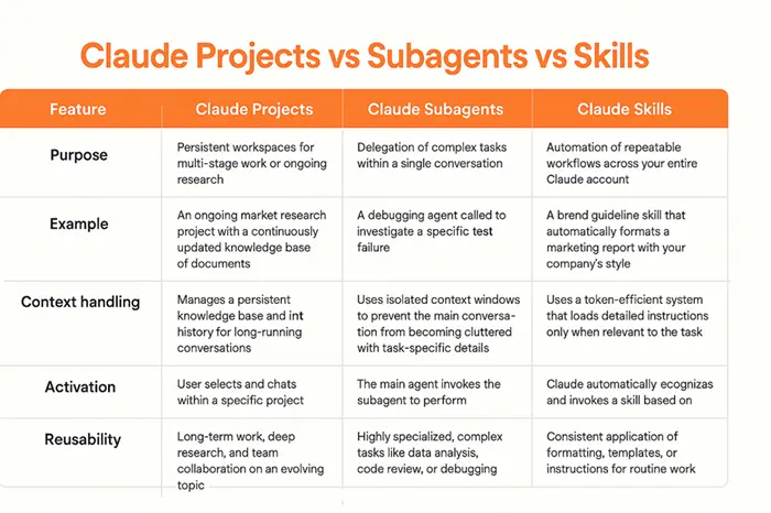 我知道你们中的一些人仍然在弄清楚 Claude Skills 与 Projects 与 Subagents 的主要区别。