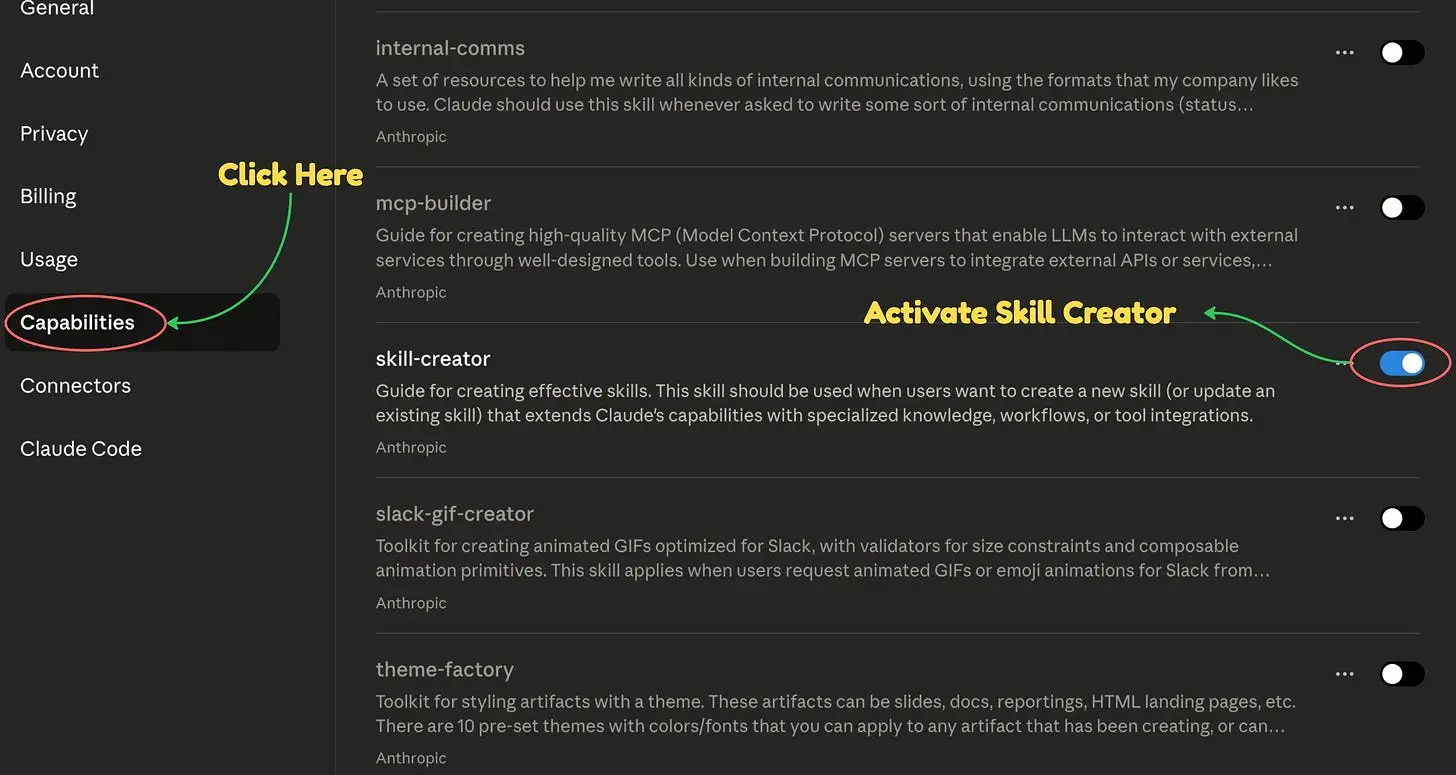 - 滚动到"Skill"部分并切换"Skill Creator"。