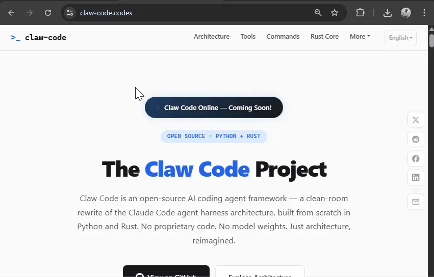 他们将其描述为 Claude Code 内部架构的干净重写;用 Python 和 Rust 从零构建。