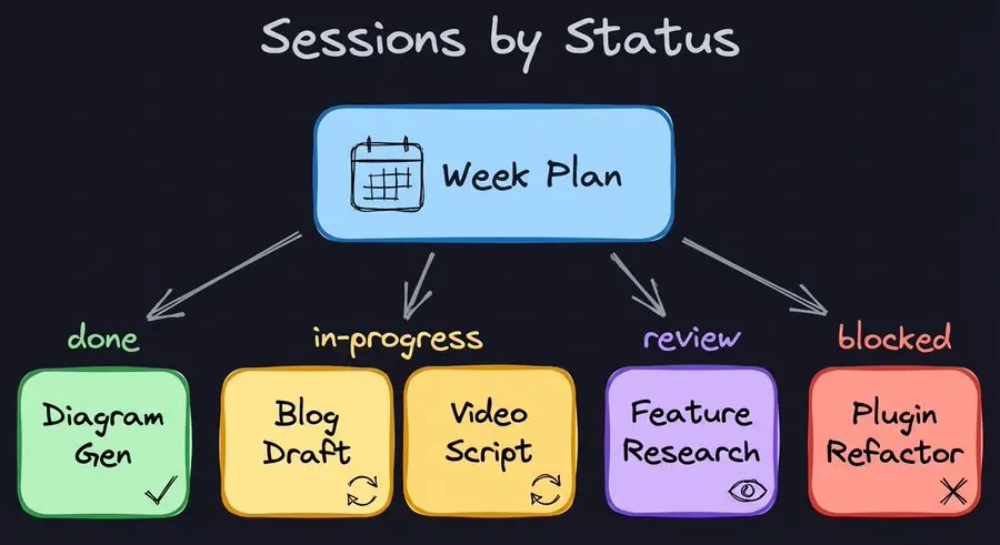 每个工作区在 Obsidian 中都有一个会话文件。仪表盘会自动生成。每个会话都有一个关联字段,指向其对应的仪表盘。Obsidian Base 会自动查询所有已关联的会话——状态、日期、标题、关联工作区。