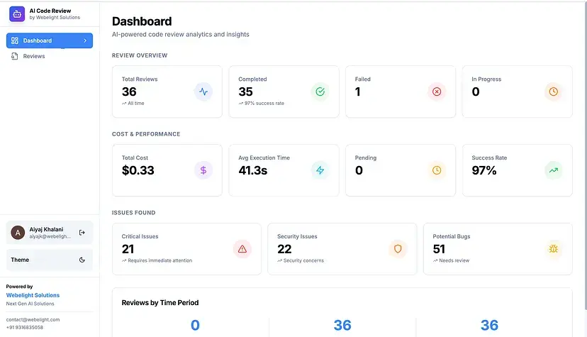 我脑海中还有另一个目标:我们需要一个分析仪表板,让技术主管和团队负责人能够审查统计数据,跟踪代码质量趋势,并了解AI在捕捉什么。