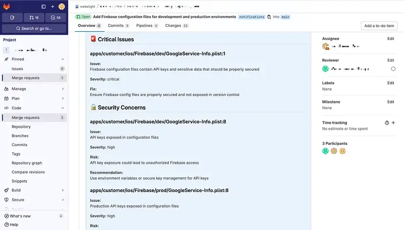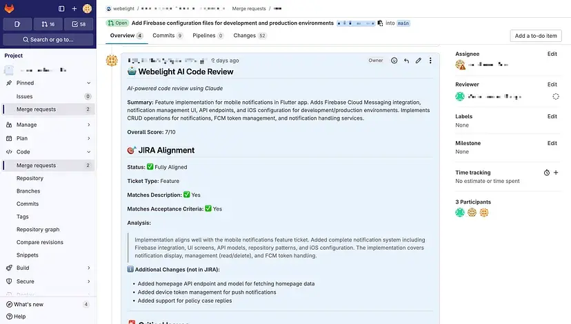 AI的审查评论直接出现在GitLab MR上,并包含JIRA对齐分析AI会分析PR变更是否满足了JIRA工单中描述的所有标准这已经捕获到多次开发人员忘记实现部分需求的情况,或者添加了本应是单独工单的功能
