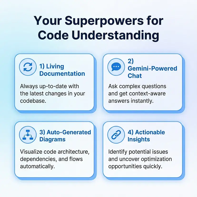 每次合并拉取请求后,Code Wiki都会自动更新自己。不需要重新导入整个仓库。没有延迟。没有过时的文档。
