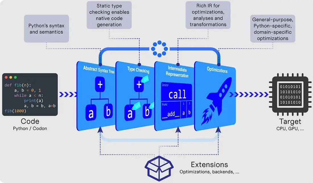 与Python的解释性质不同,Codon使用提前编译(AOT)。它分析你的整个程序,执行激进的优化,并通过LLVM(用于Rust和Swift等语言的编译器基础设施)将其编译为原生机器码。