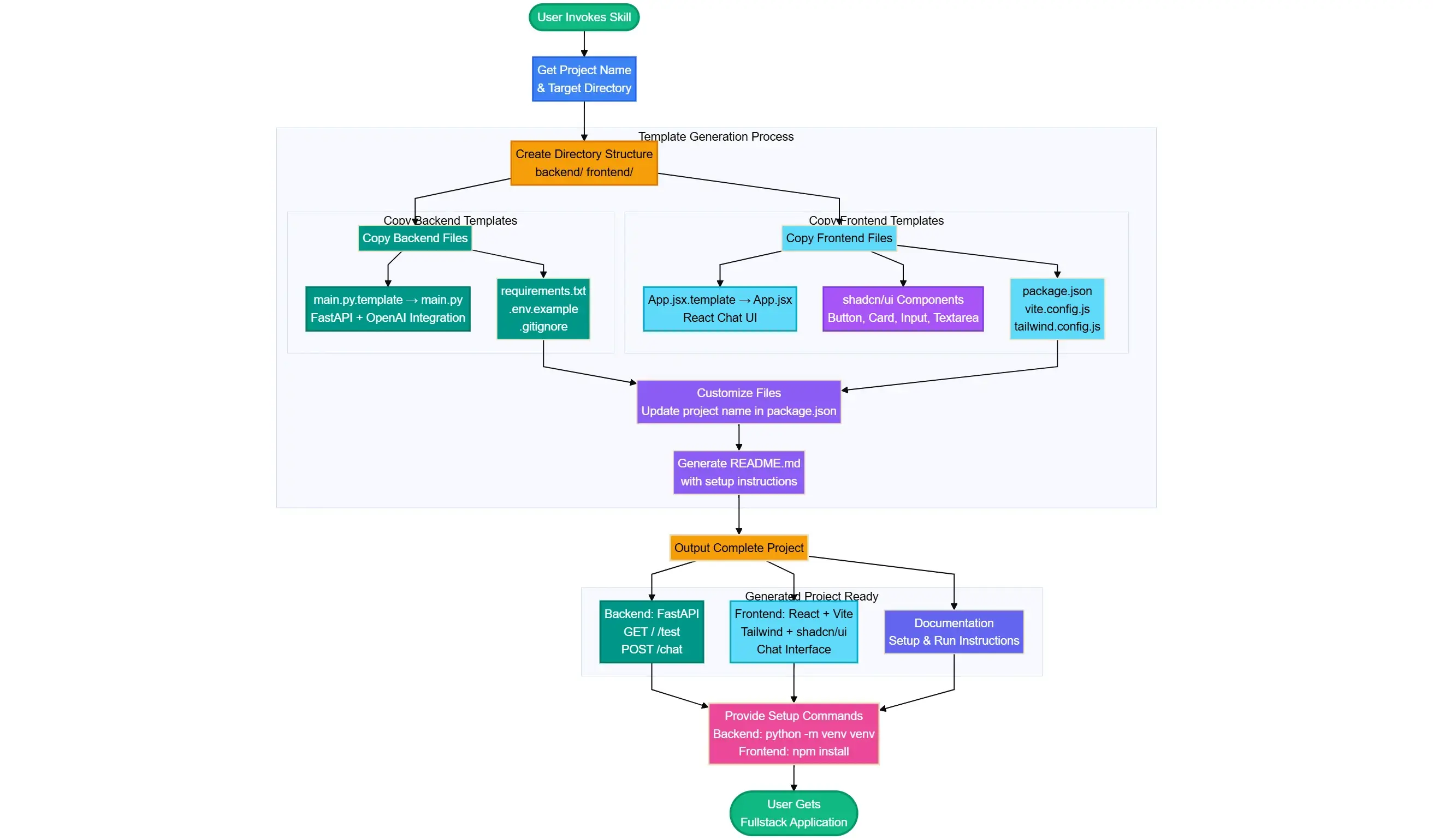 本文开发的 Claude Skill 可以自主构建一个完整的全栈应用程序模板,将所有后端和前端连接起来——创建文件夹结构、配置文件、后端 API 端点、环境设置以及一个初始的 React + Vite UI——而无需用户手动编写每个文件。当您调用该技能时,Claude 会动态加载技能包中定义的指令和脚本,并根据这些指令生成代码,最终生成一个可运行的工作原型。由于技能是可重用的指令和资源模块,因此可以再次调用同一个技能,以相同的结构和配置搭建新的项目。