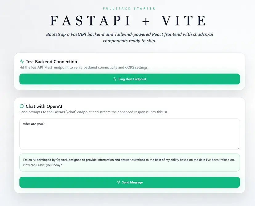 Swagger Docs: http://localhost:8000/docs该模板包含一个集成了 OpenAI 的聊天界面、测试端点连接、使用 shadcn/ui 组件的 Tailwind CSS 样式以及 Framer Motion 动画。
